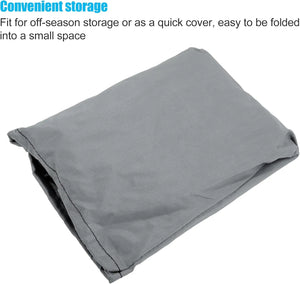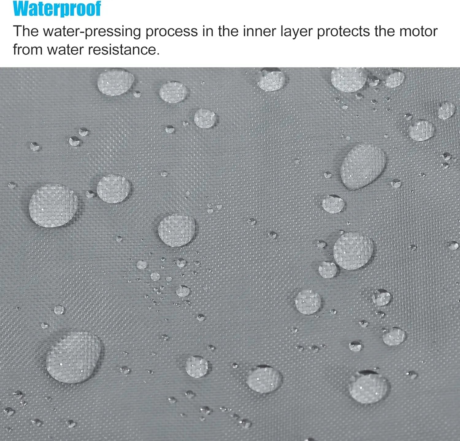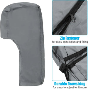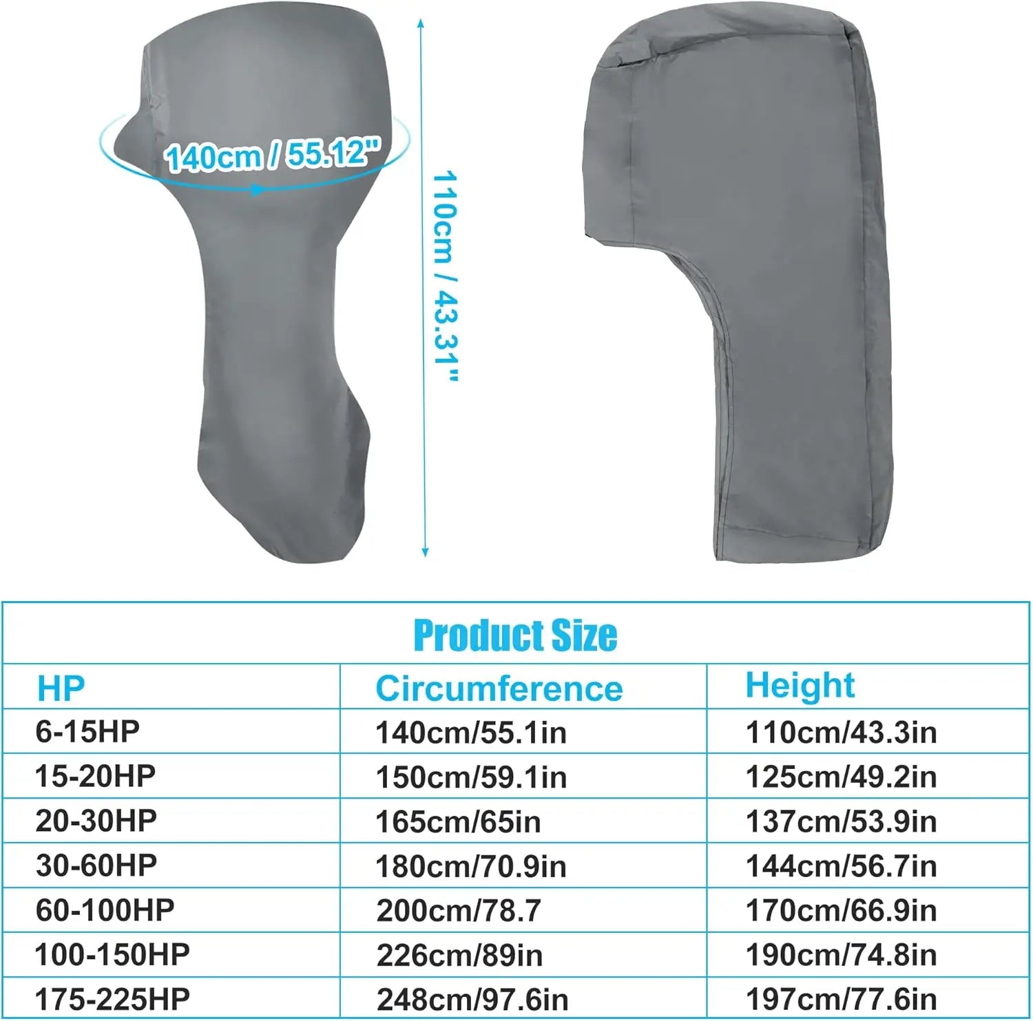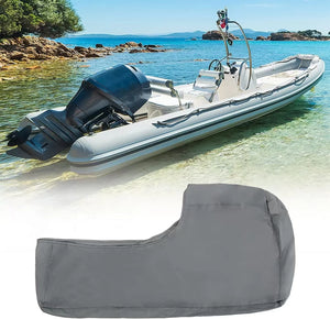 This grey waterproof boat cover is made from durable 210D Oxford fabric to protect outboard motors from sun, rain, wind, dust, and scratches.