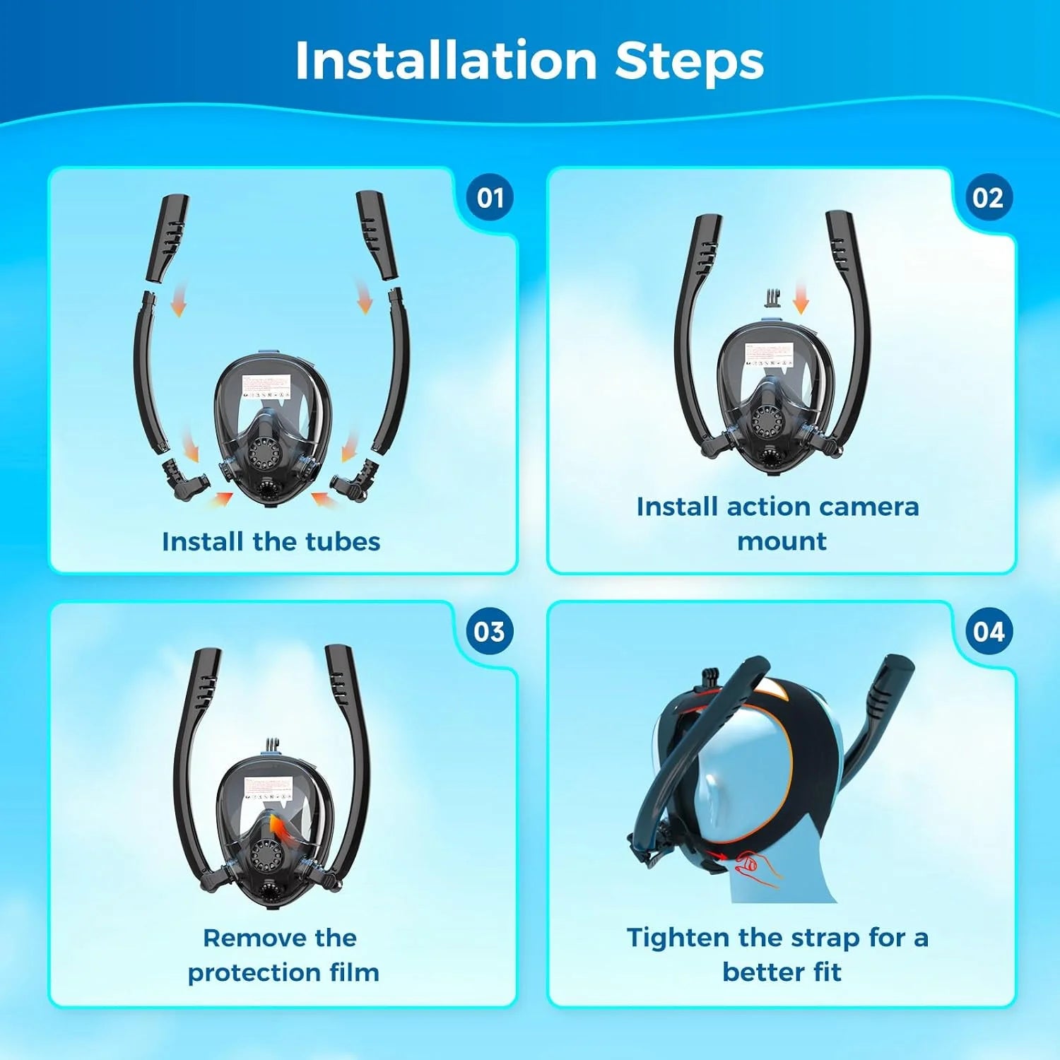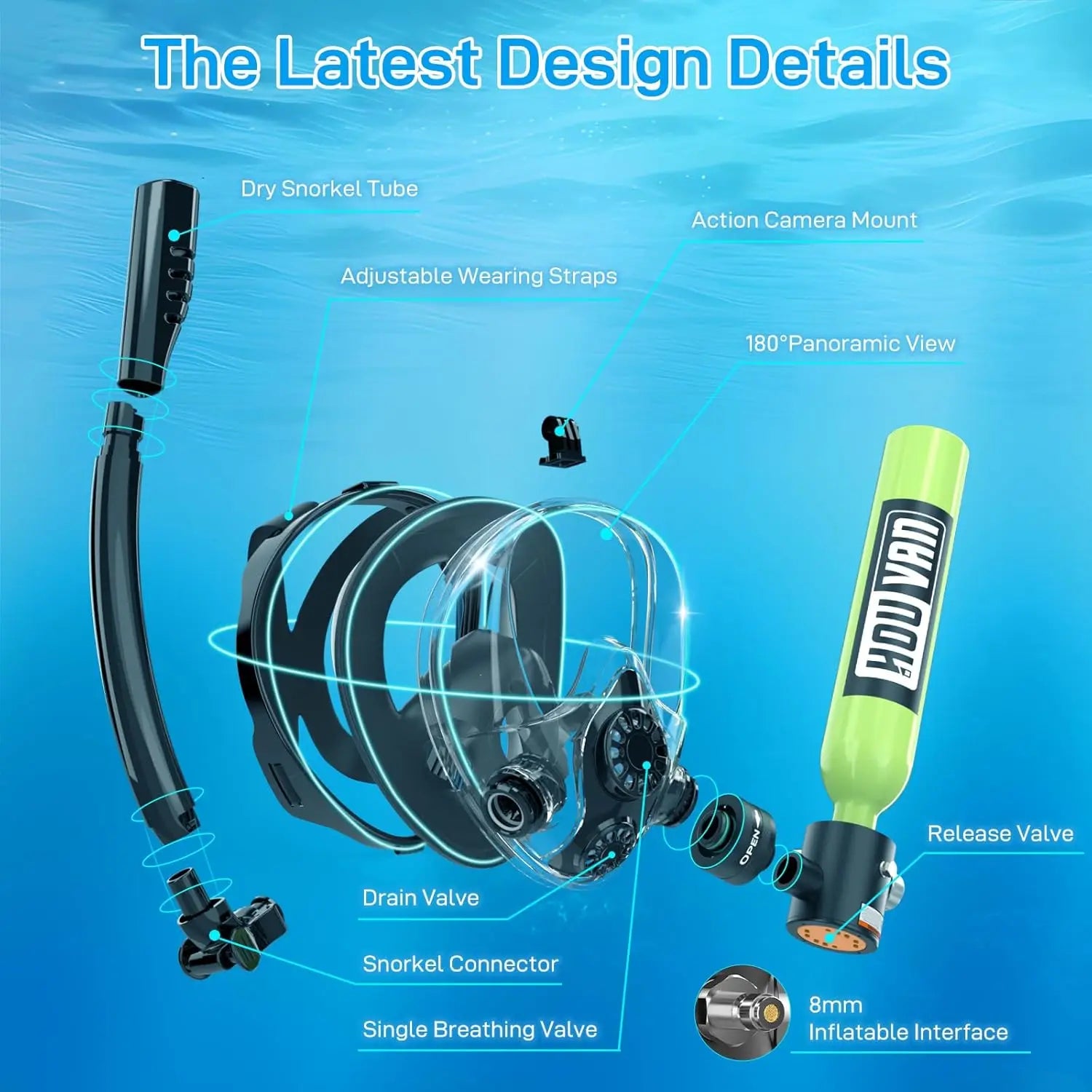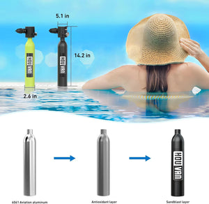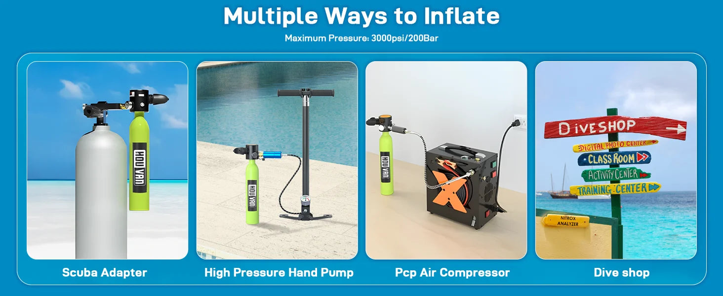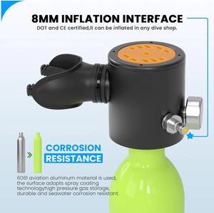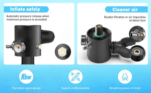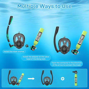 The mask has valves to release air and drain water easily. Use it for snorkeling, diving, fishing, and more. The tank has a glowing pressure gauge and can be refilled at dive shops, with a pump, or an air compressor. Dive in and have fun!