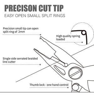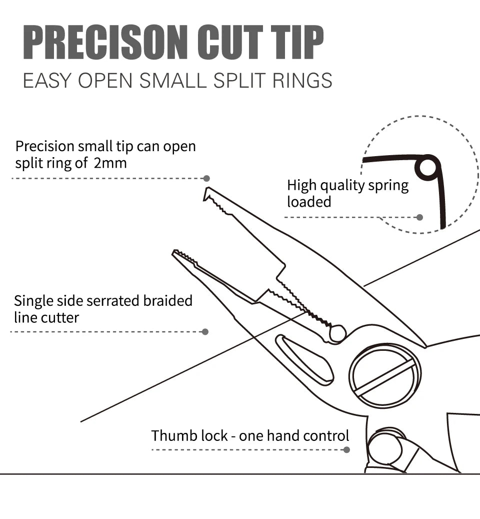 Titanium coated, stainless steel pliers useful for various fishing applications like opening split rings and cutting braided line.