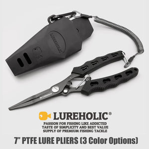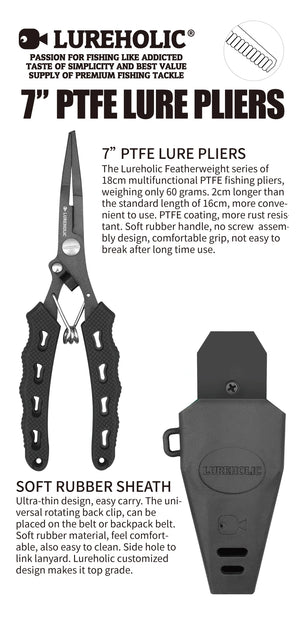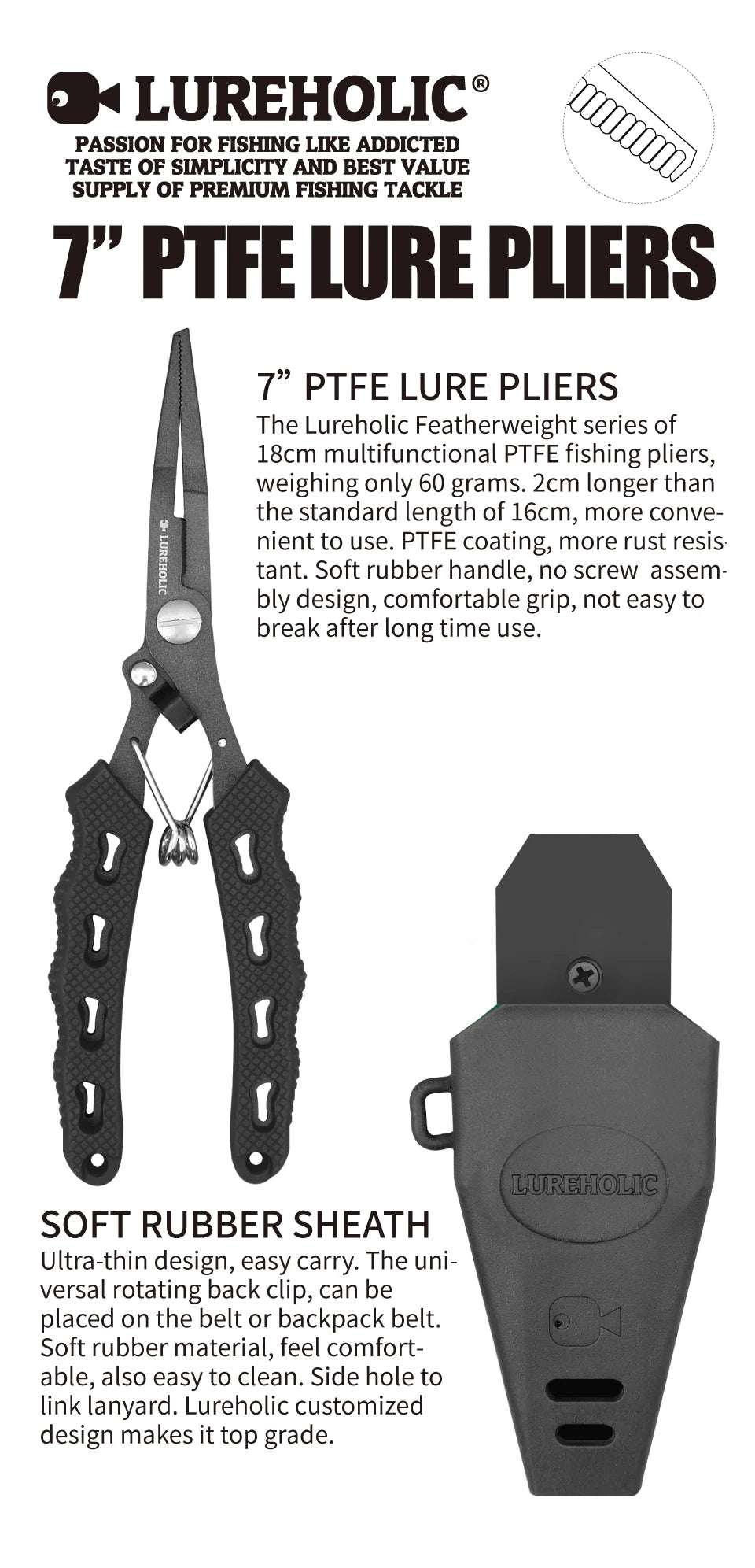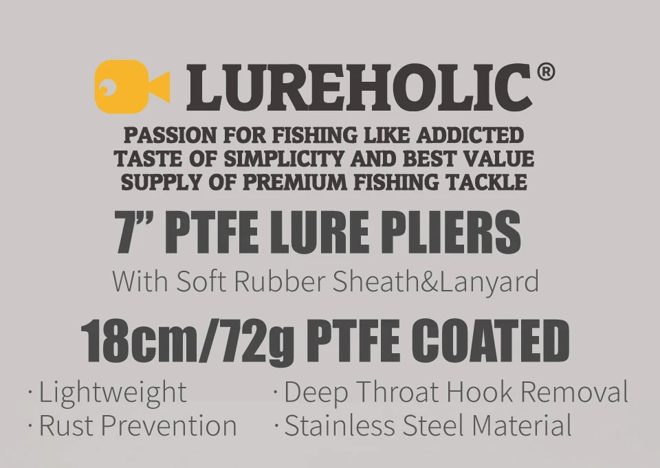 Tackle your fishing tasks with a smile using Lureholic’s 7” PTFE coated pliers! At 18cm and just 72g, these handy tools make removing hooks and cutting braided lines a breeze. Plus, the soft rubber sheath and lanyard keep them close and comfy. Lightweight, sharp, and ready to play—your fishing buddy just got an upgrade!