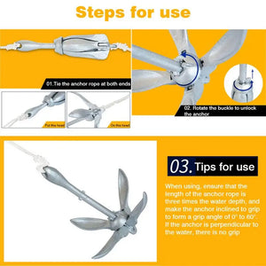 Simply slide the grappling anchor collar upwards, fold open the 4 flukes, slide the collar back down, and lock into position. Use as much anchor rope as possible to create better horizontal drag on the bottom surface of ponds, rivers, lakes or oceans.