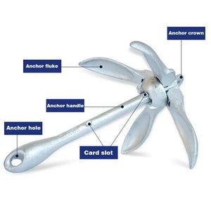 The anchor features the A-shaped anchor handle has an elliptical head, and the anchor wings are concave lotus shaped, high-strength carbon steel material, and the surface is hot-dip galvanized, suitable for freshwater lakes and sea fishing. It is recommended to tie a boat with two anchors in case of fishing, so that the boat is not easy to spin.