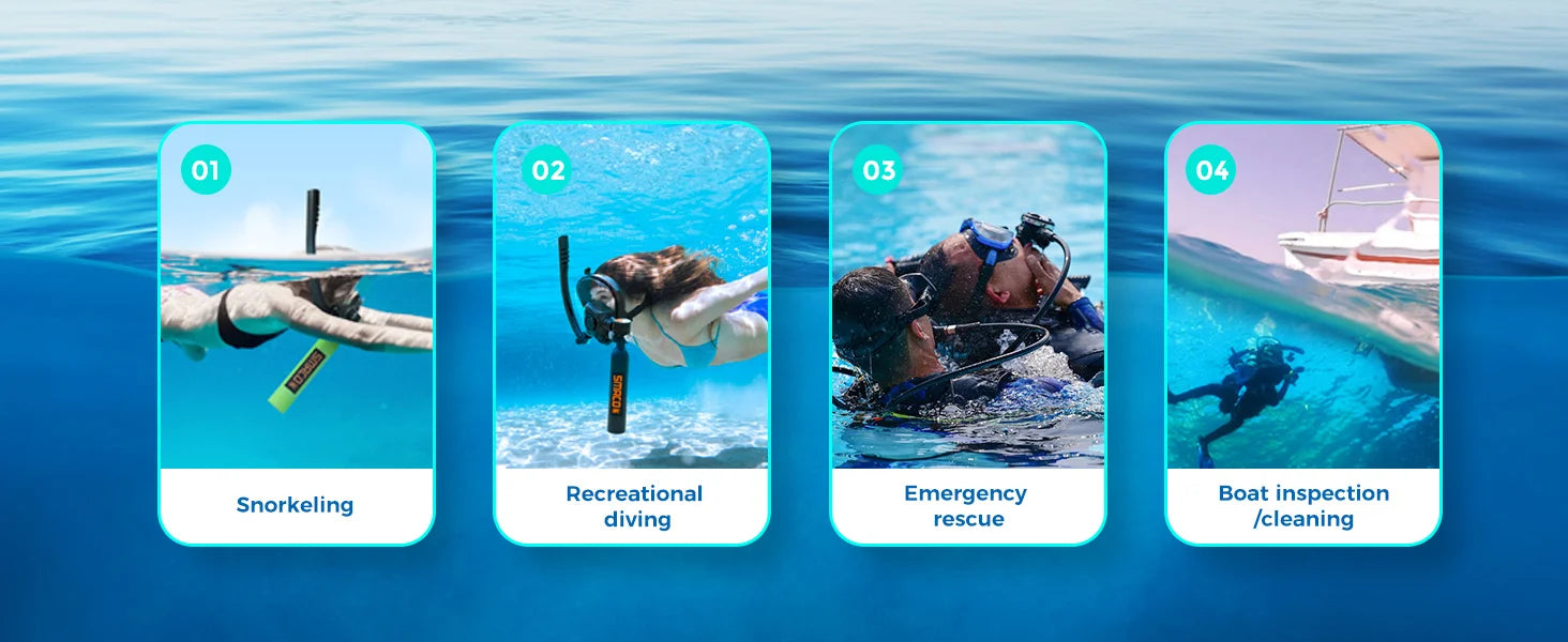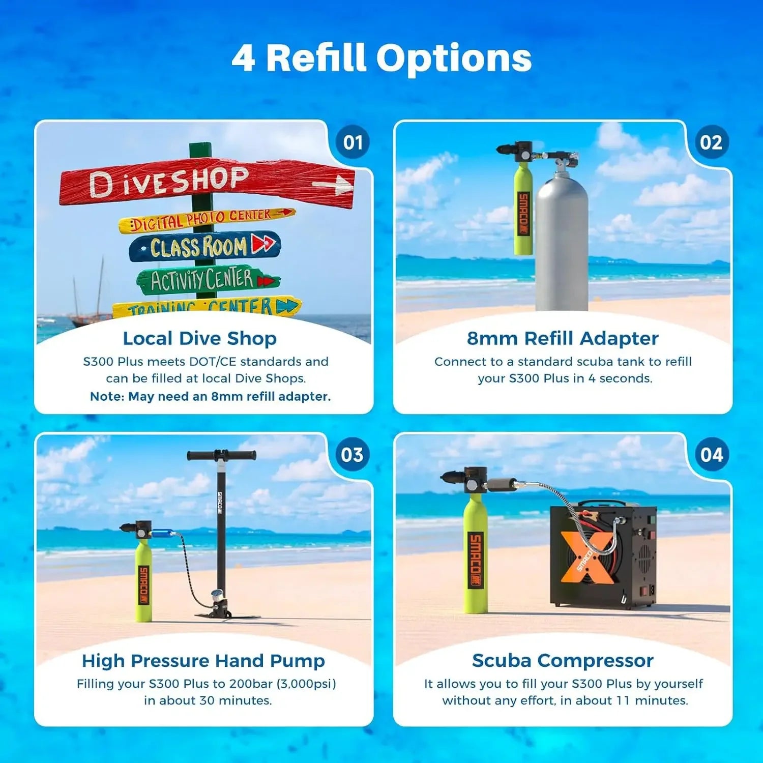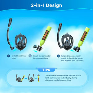 Breathe easy underwater with the SMACO scuba kit! It has separate channels for breathing in and out, keeping your mask clear and comfy. Use it like a snorkel on the surface, then dive and enjoy up to 6 minutes of air from the mini 0.5L tank. It’s compact and travel-friendly, perfect for snorkeling, diving, and underwater fun up to 33 feet deep.