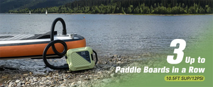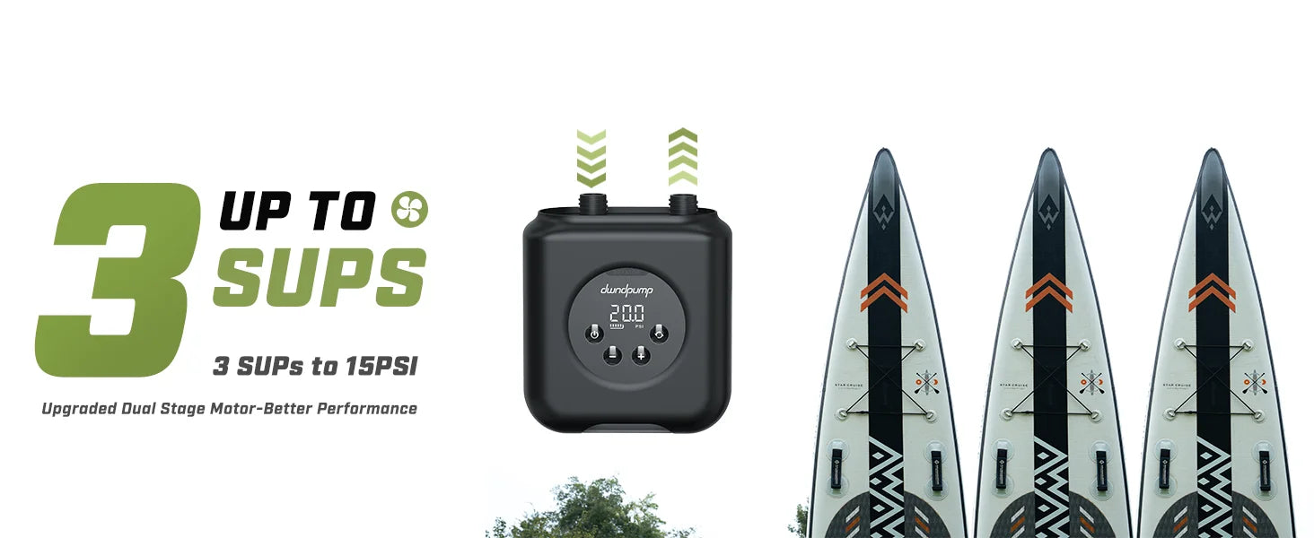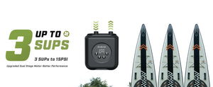 Features: 7mins to 12psi, 10mins to 15psi. 3 sup boards in one charge.