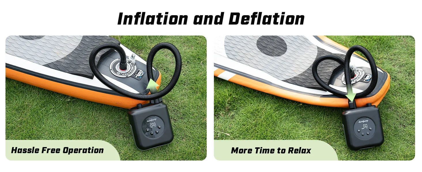 Usage: Inflation and deflation for inflatable SUP, Surfing Kite, Swing Ring, Boat, bed, tent, Mattress etc.